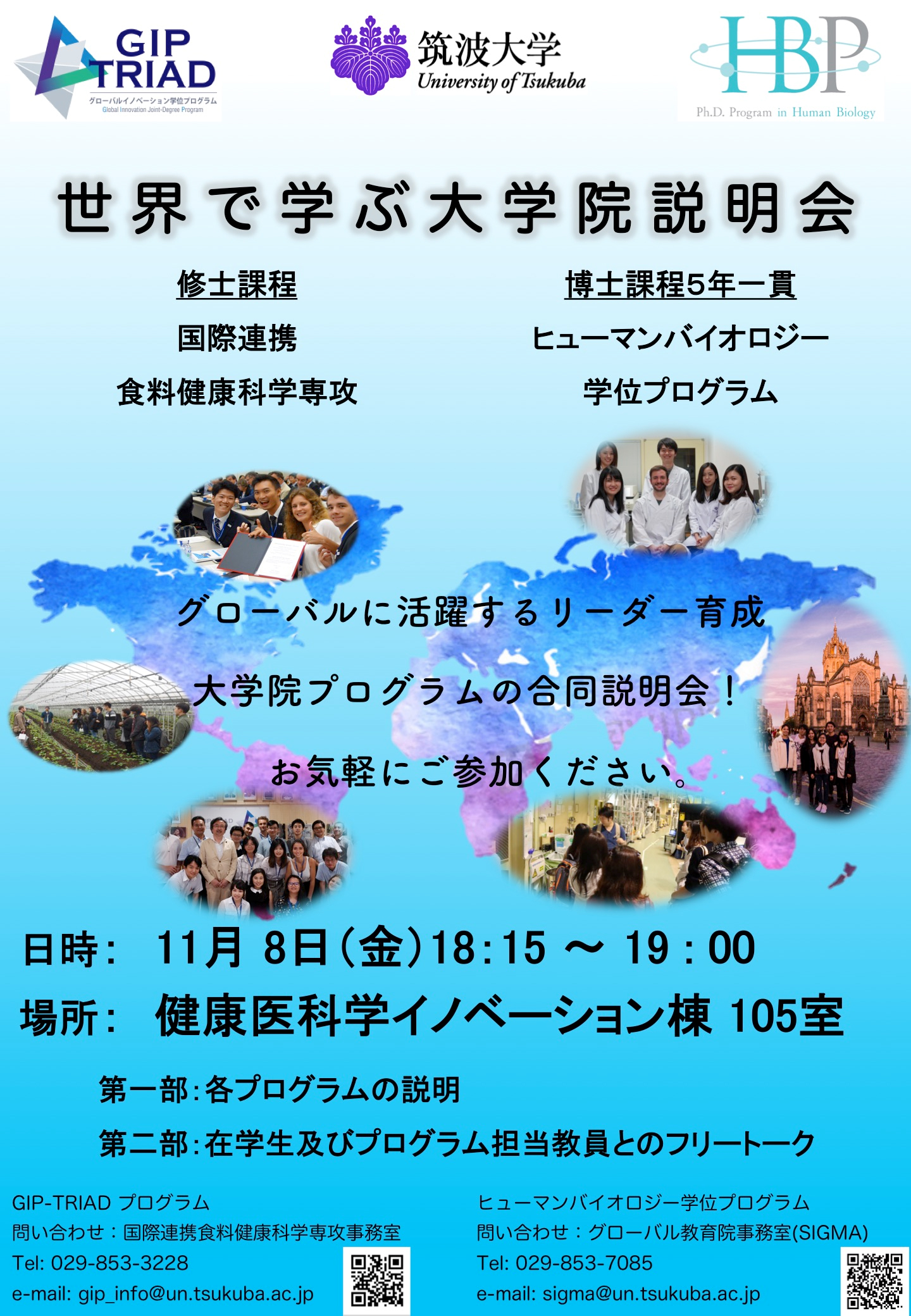 世界で学ぶ、英語で学ぶ、海外からの仲間と学ぶ、をキーワードとして、ヒューマンバイオロジー学位プログラム(HBP)とグローバルイノベーション学位プログラム(GIP: 国際連携食料健康科学専攻)の合同説明会を開催します。